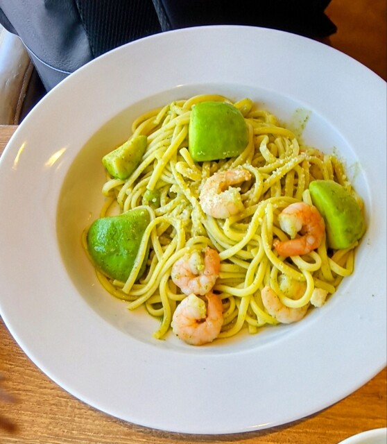 パスタのモチっとコシのある食感は絶妙なバランス、海老とアボガドのバジルソース生パスタを注文!