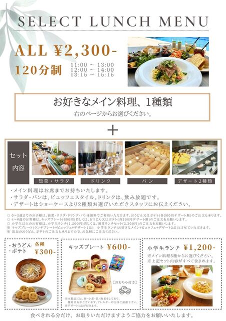 ※ランチは11:00/12:00/13:15 にてご予約承ります。