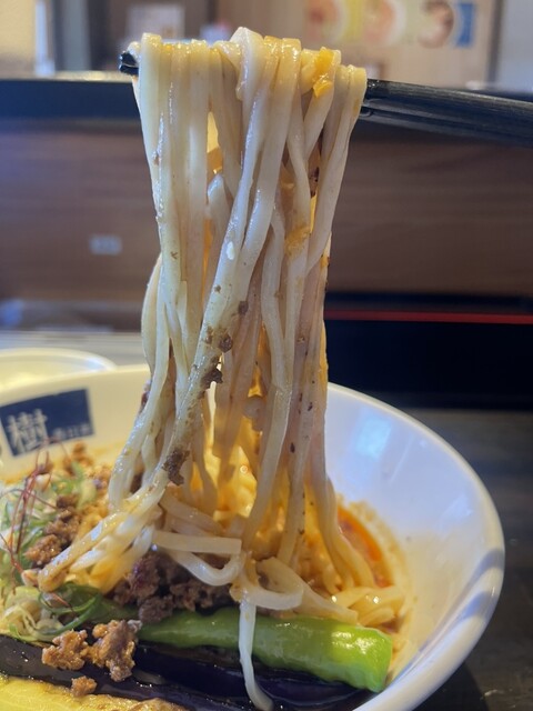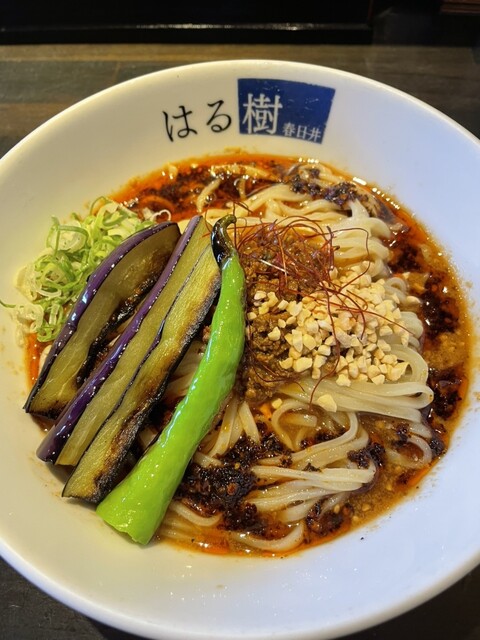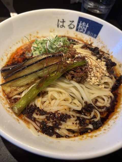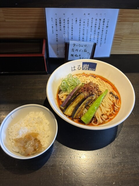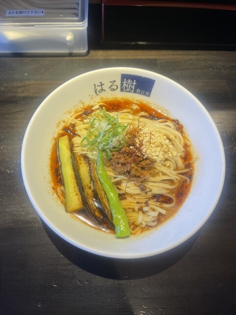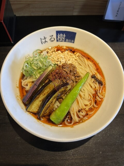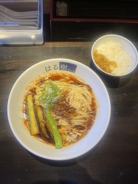 連食で冷やし求めて春日井市柏原町「はる樹」へ。開店5分前で4名待ちでした。「秋茄子のせ冷製担々麺(ザーサイとご飯付)」1,250円注文。中辛で頼みました。平打ち麺はもっちりで美味しいです。スープは酸味...