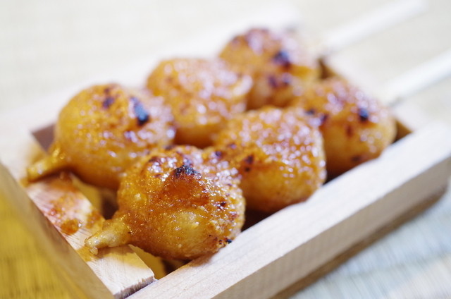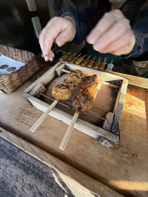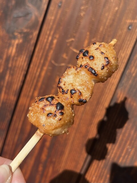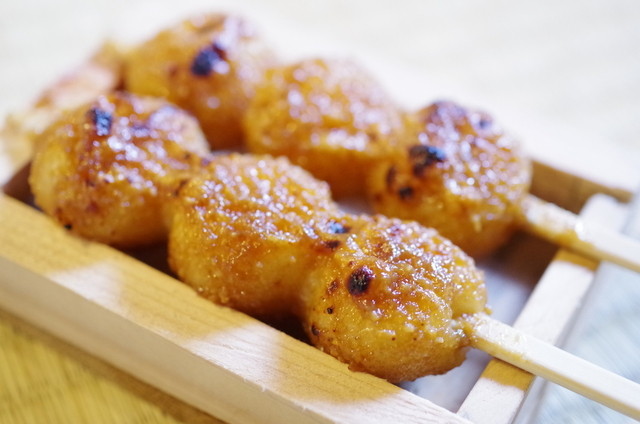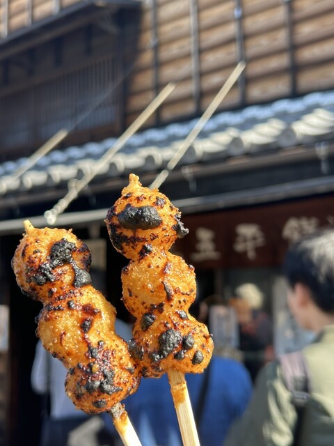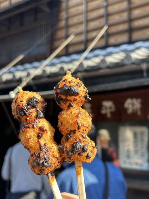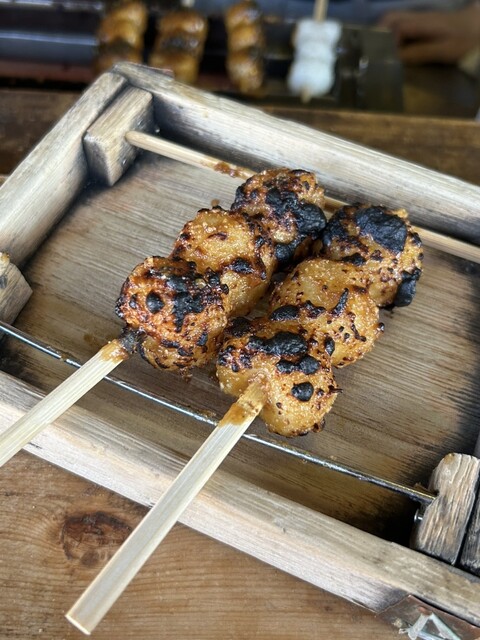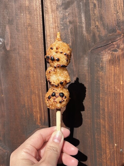 五平餅は岐阜県や長野県をはじめとした中部地方の郷土料理、こちらでは「わらじ型」でなく食べ歩きしやすい「団子型」で、粒感のあるお米にピーナッツ、胡麻、胡桃、醤油、砂糖、味醂をブレンドした甘さ控えめの特製ダレを塗って表面を焼き上げ、ホクホクで香ばしく素朴な味が楽しめます。
