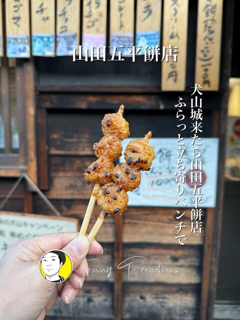 城下町名物手作り五平餅の山田五平餅店です。 食べ歩きの定番、手作りのタレが絶品の五平餅です。 手作りの五平餅を注文を受けてから、お焼きいたします。 3分程で焼き上がったお餅に、自家製のタレをたっぷりつけて お召し上がりください。冬は大きな壺でほっこりと焼いた焼き芋、 夏はソフトクリームやかき氷もあります。