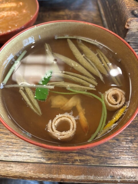 私はかしわ(¥1100)と吸い物(¥275)、妻はかしわと赤だし(¥275)、娘は貝柱(¥1650)と赤だしを注文する。