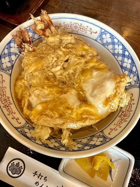 プリっと揚げられた海老天を卵がやさしく包み込み、黄金に輝いています。〔ウワァァァッ〕
