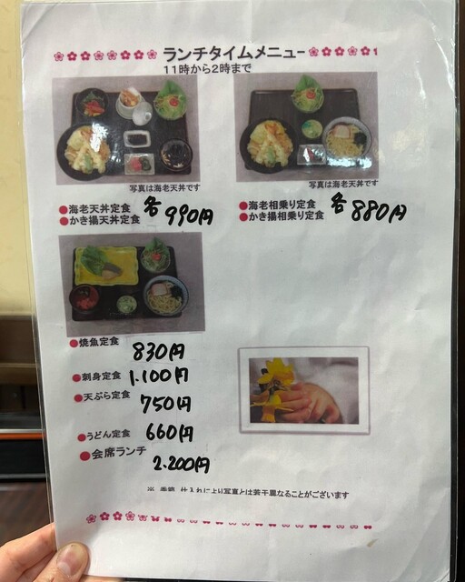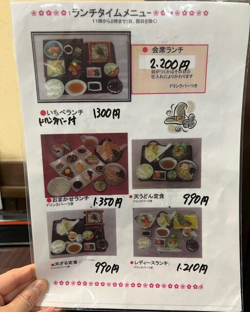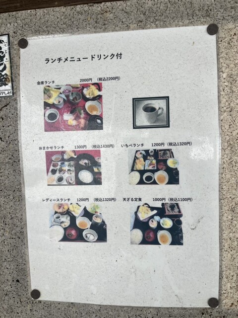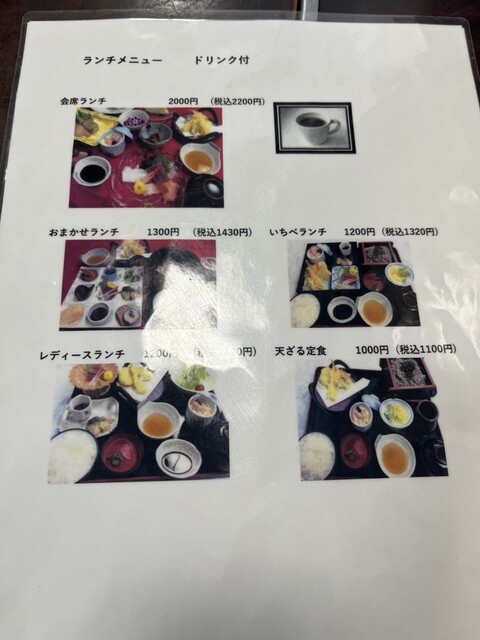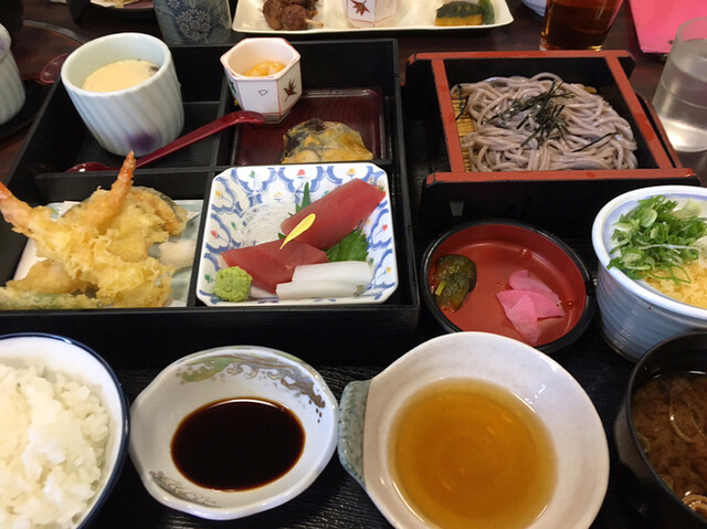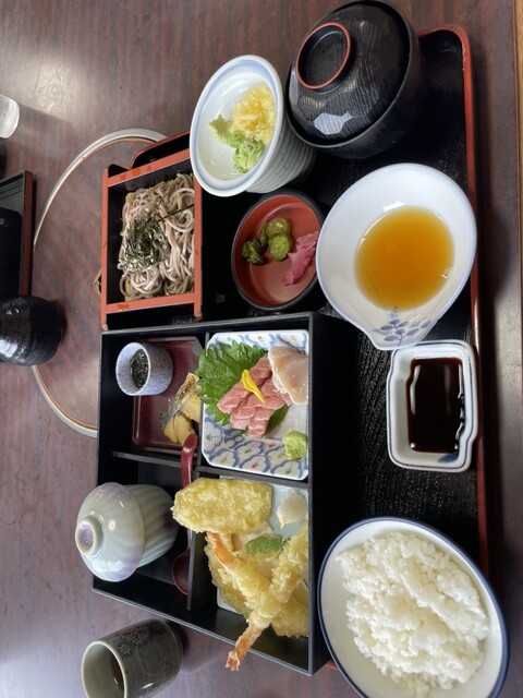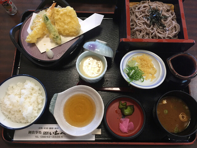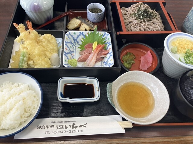 予約して伺いました。いちべ定食1200円をいただきました。天ぷら、刺身、焼魚、茶碗蒸し、そば、汁物、ご飯と欲張りな仕様で、1200円はお値打ちですね。静かにランチを楽しむことができました。ご馳走様でした。