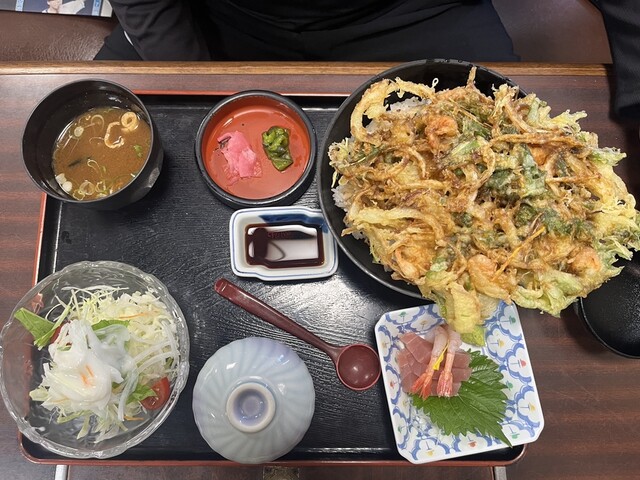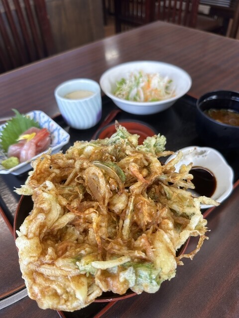 大きなかき揚げがのった丼と刺身、茶碗蒸し、サラダ、味噌汁のセットで990円
