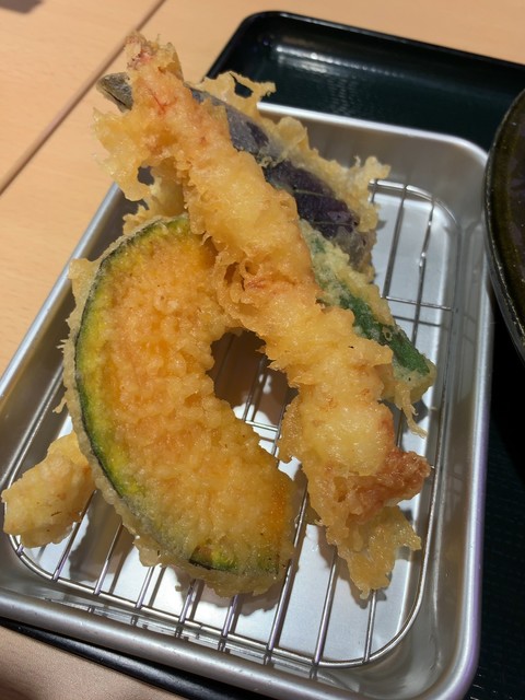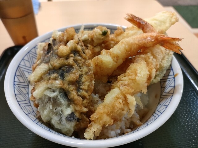 ショーケースにはカツ丼、天丼、石焼ビビンバ、うどん、蕎麦の食品サンプルが並ぶ。