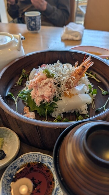 メニューは「ズワイ蟹と碧南天日干ししらすの海鮮桶盛りひつまぶし御膳」を注文。