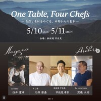 中部地方4名のシェフによる、自然と食材との対話から生まれる料理 【One Table, For Chefs】 ―自然と食材をめぐる、中部からの食卓― 長野と愛知、それぞれの土地で食材と向き合ってきた料理人が集い、 風土の異なる二つの地域が、料理という表現で交差する特別な食事会です。 山や海で育まれる命、里で育てられる命。 生産地の個性を尊重しながら、 対話するように構成された一皿一皿を、お楽しみください。