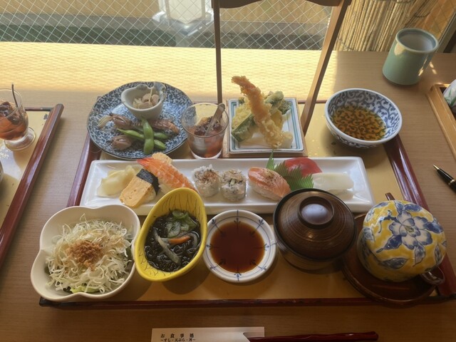 予約して伺いました。平日でしたが、かなり混んでいます。3名以上だと座敷に案内され、2名席は庭が見えるので良い雰囲気でした。 ビールも頂きました♪ ◼️すし御膳 松 まぐろ、巻き寿司、海老、いくら、貝類、玉子焼 小鉢、口取、天ぷら、茶碗蒸し、赤だし、サラダ、 デザート たくさん... 詳細を見る