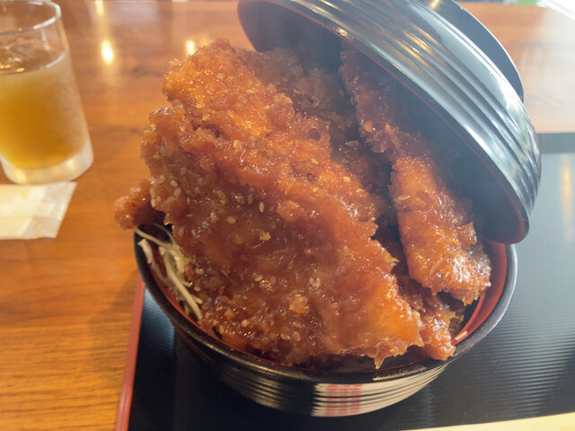 ソースかつ丼の様に薄切りのカツが名前の通り甘いタレに漬けられていて、衣の表面には白ごまがまぶされています。