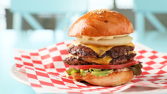 カリフォルニアをイメージした空間で100%ビーフを鉄板で焼き上げるスマッシュバーガーを堪能