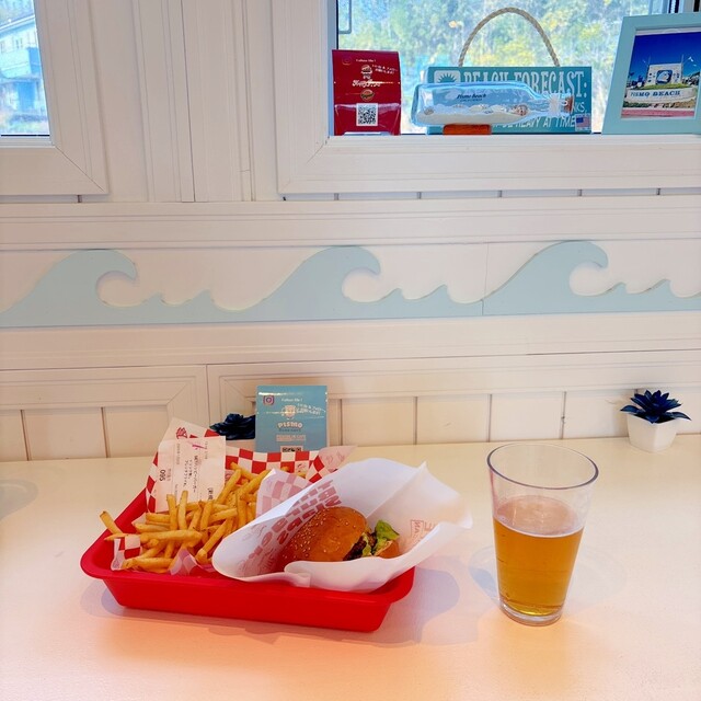 カリフォルニアスタイルカフェ″PISMOBLUE CAFÉ”内に構える【HAPPY BURGER】。つなぎ無しの100%ビーフを鉄板でカリッと焼き上げる「スマッシュバーガー」をご提供します!本場アメリカの味を心ゆくまでご堪能ください♪カリフォルニアの雰囲気を再現した空間にはペット同伴OKのテラス席も完備◎日本では手に入らないようなグッズを販売するカリフォルニアのギフトショップも併設しております。
