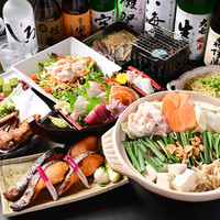 プリップリの国産牛もつがたっぷり入った「もつ鍋」がメインのコース!美味しいだけでなくコラーゲンたっぷりのもつ鍋は、女子会にもおすすめ◎さらに、新鮮な海の幸を贅沢に盛り付けた「船盛り5種」や、旨みあふれる「西京焼き」、ジューシーな「手羽先の黄金焼き」などボリュームも満点!120分の飲み放題付きなので幹事様も安心です。