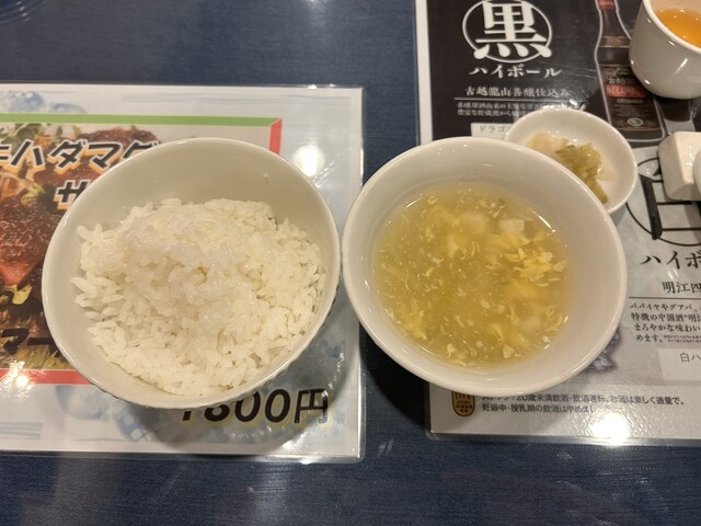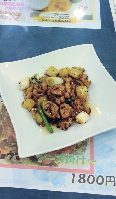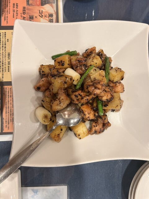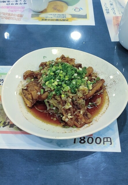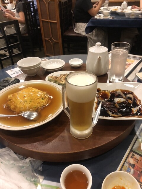 フカヒレ麺2100円、餃子500円、XO醬海鮮炒め1650円、天津飯S1200円、さつまいも飴1000円をオーダーしました。