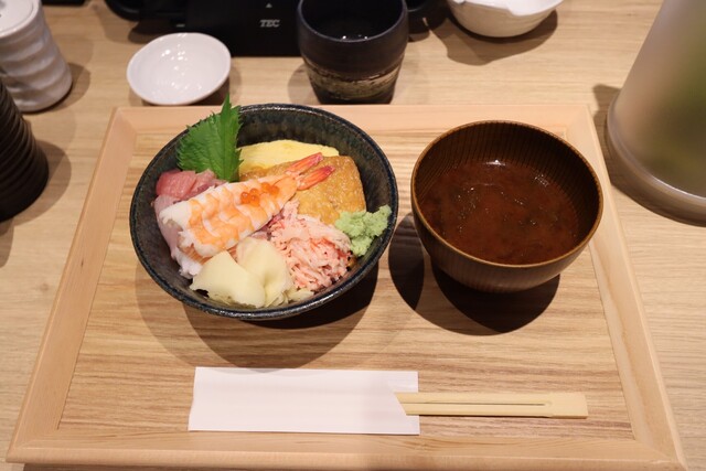 赤身、玉子焼き、蟹のほぐしたモノ、サーモン、大葉、おいなりさんの皮など。