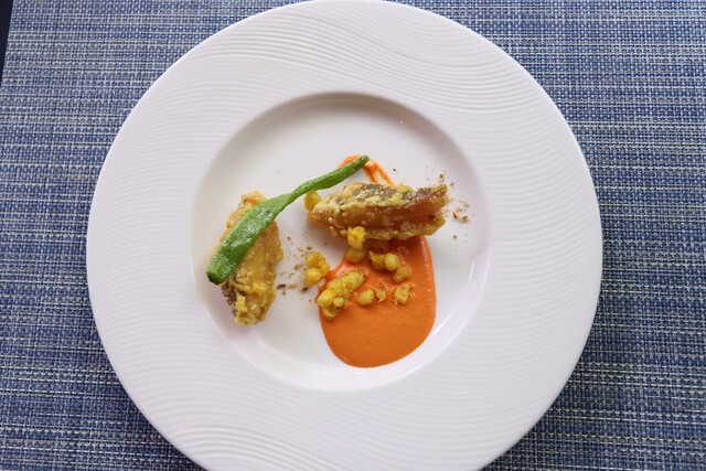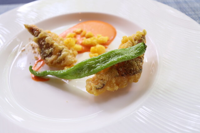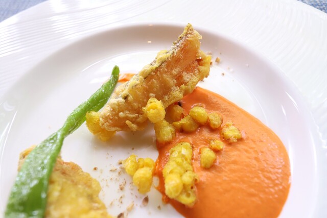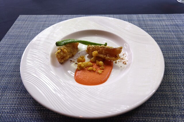 炭酸水でカリッと揚げてあります、パプリカの甘めのソースで。