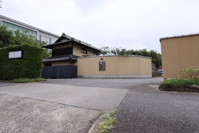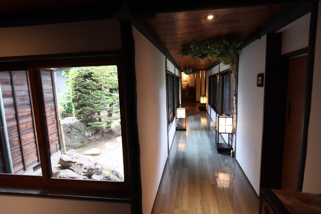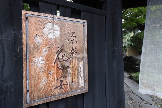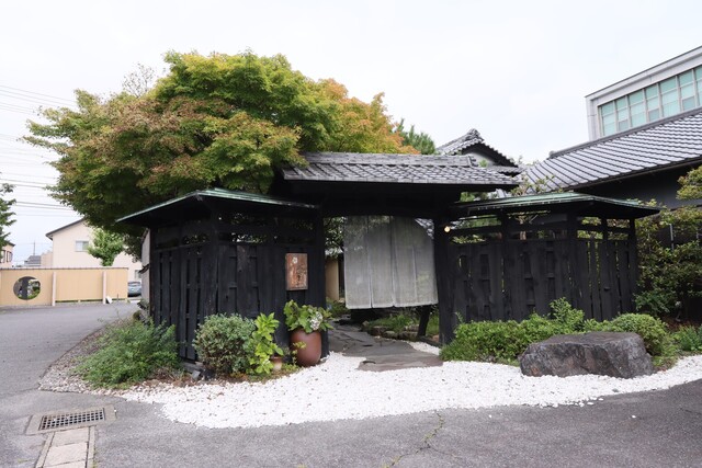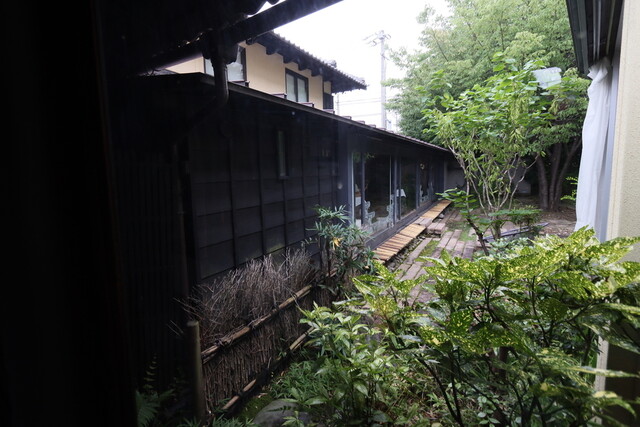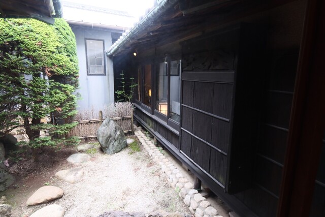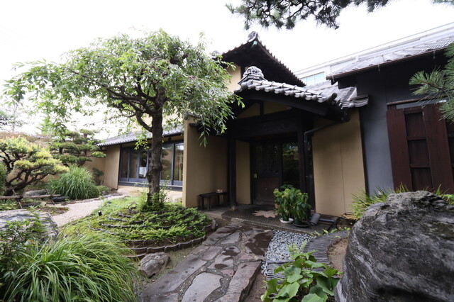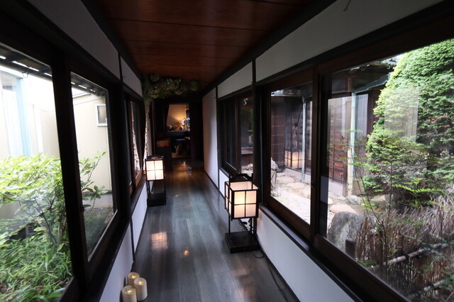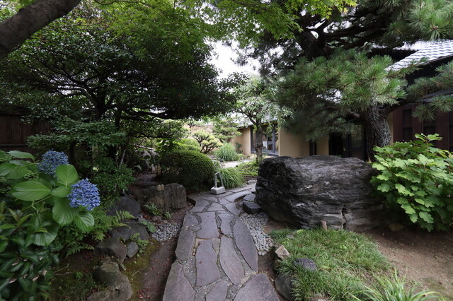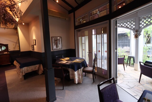 日本庭園のアプローチ、和と洋の店内は奥に広くテラスも。
