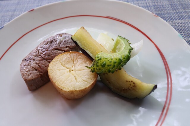 添えてあるのはゴーヤ、玉ねぎ、ナスとジャガイモ。