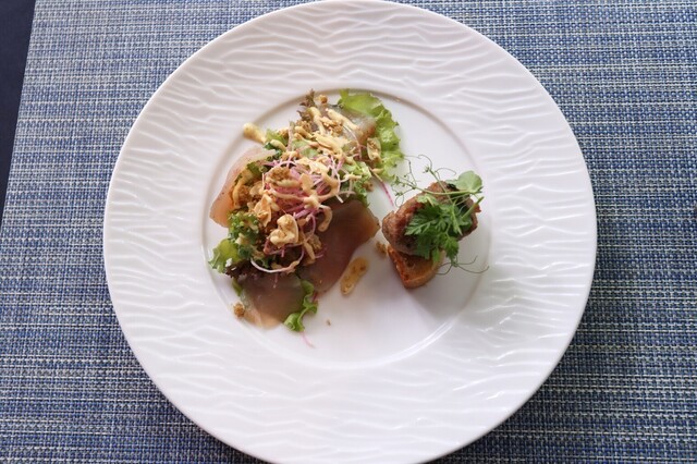 マグロを生ハムのように仕上げてあります、マスタードソースで。