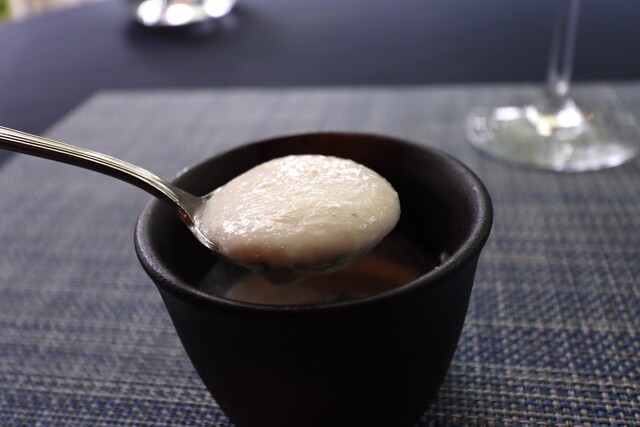 ドロッとしていてミントの葉を浮かべてあります。