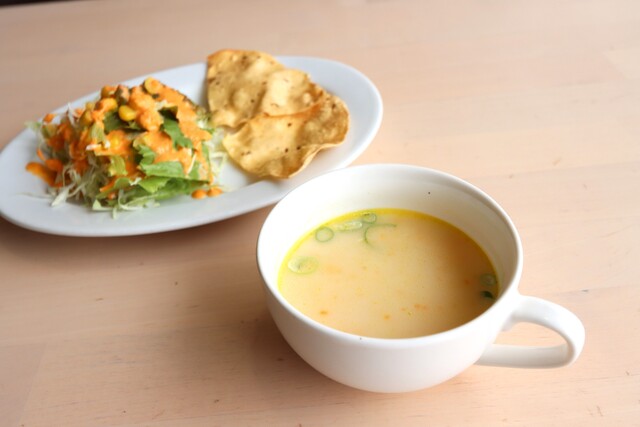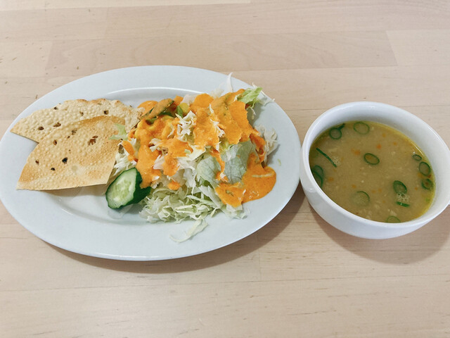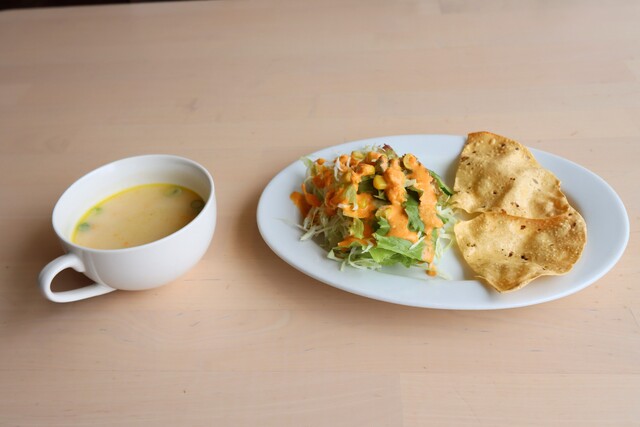 スープとサラダが付いて、選べるカレーはキーマでお願いしました。...