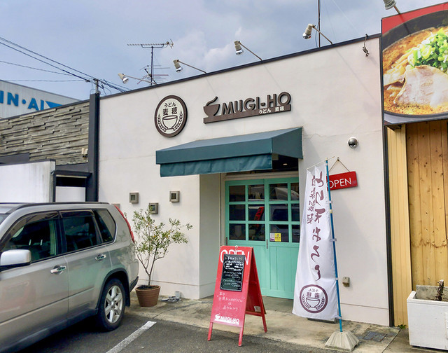 お店の外観は、白い壁に水色の玄関扉で、うどん店と思えないカフェのような雰囲気。
