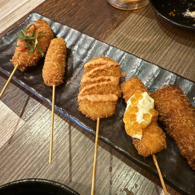 日~木曜限定でコスパ最強の全品串揚げ食べ放題が登場!!人気ナンバー1のサーモンいくらタルタルやモッツァレラチーズなど全14品全て食べ放題!ゆったり2時間食べ放題で980円は間違いなく刈谷最強。。。しかも飲み放題もつけられます!