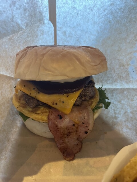 ビーフバティ、チーズ、スクランプルエッグ、ベーコン、レタス