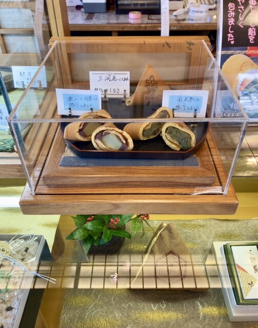 この日・この時間、先客は入れ替わりで、私のみでした。ショーケースには、その 三河巻 を始め、生菓子も色々あります。今回はお初という事で、お店の方には、1個単位で購入できることも確認し、