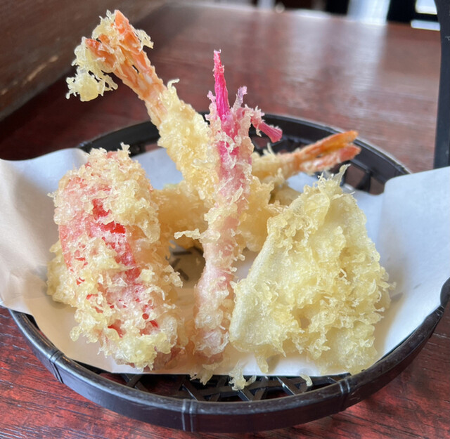 ざるそば天丼ランチ。甘めのタレにサクサク揚げたて天ぷらとざるそばのコンビ。海老が2尾、何気にうれしい。