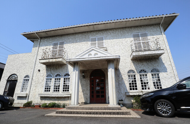 そこまで広くない駐車スペースのある昔ながらの洋風の建物。