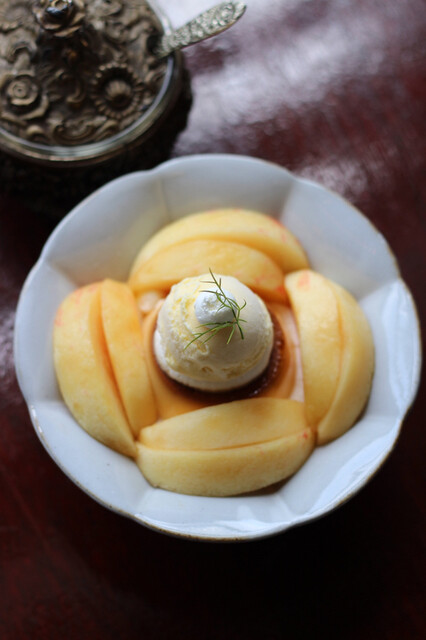 大評判の桃パフェシーズンにおじさん二人で初来店です。