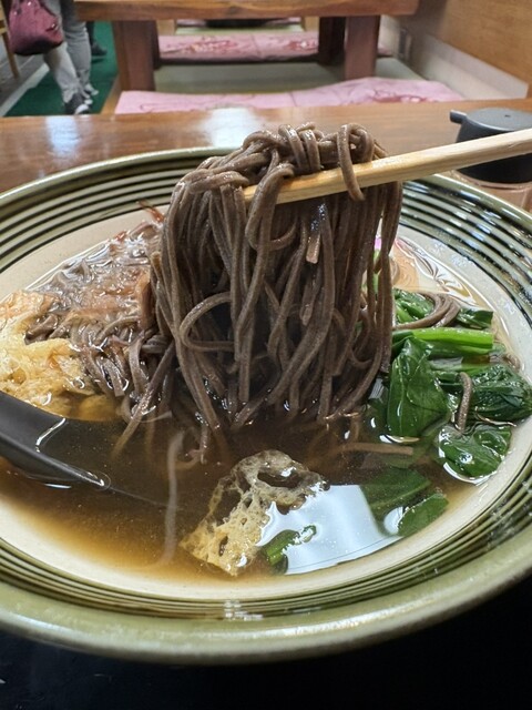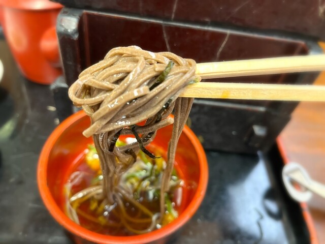 豊橋の地に明治17年(1984年)に東京は国分寺よりやってきた戸倉常五郎が創業。 黒みがかったそばはそばの実と皮を一緒に挽いた独特のもの。薫り高く、甘めのつゆとの相性が最高。