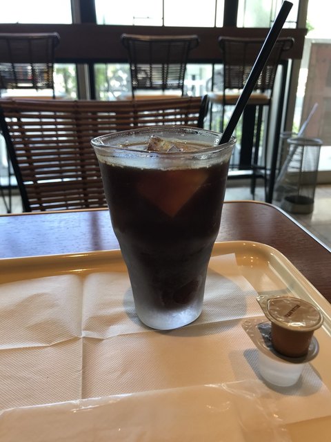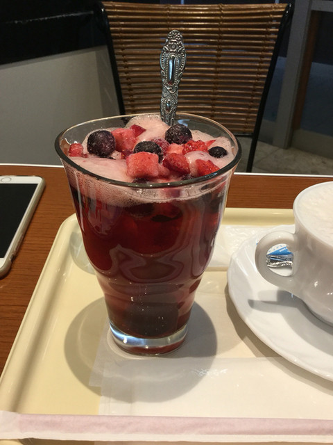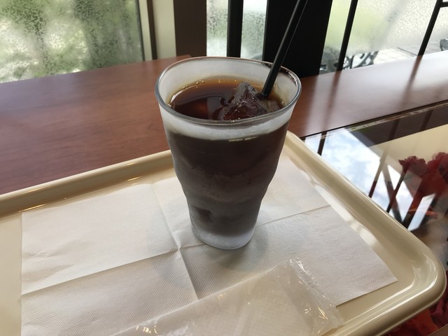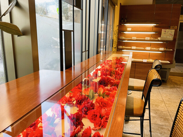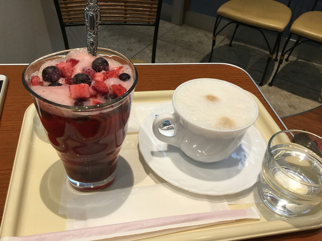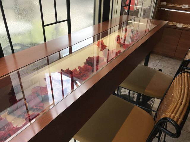 少し寒くなってきたのでホットで、糖分も少し補充です、カウンターは花を散らした目立つタイプ