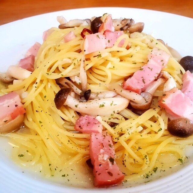 細麺で、しめじ、ニンニク、ベーコン、鷹の爪が入った具材を塩、コショウでさっぱり頂けました。