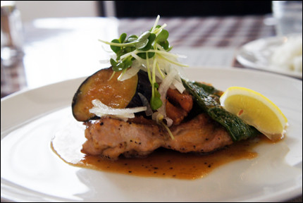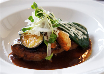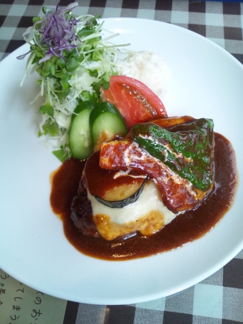 ハンバーグの上には 茄子、ピーマン、ポテト。