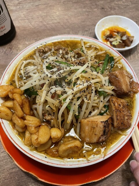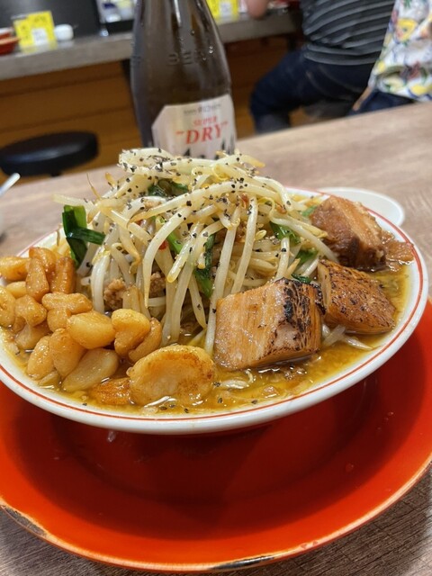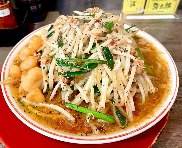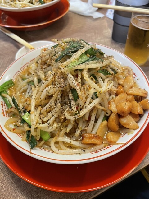 山盛りのもやしとニラ、刻み肉にホクホクのニンニクが乗った一杯は、インパクトも食べ応えも抜群。