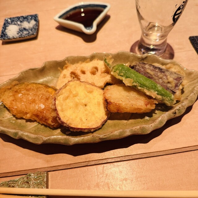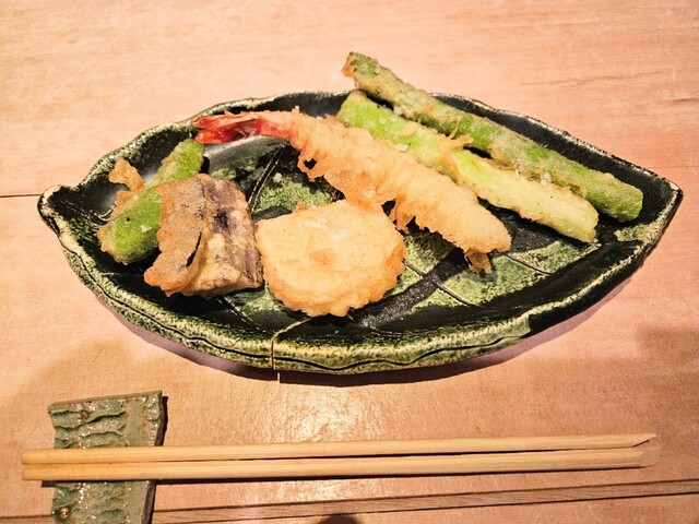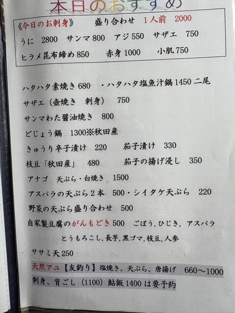 注文内容:お造り、鮎の塩焼き、とり天、海老天、アスパラの天ぷら、にんにくの丸揚げ、つくね、さんまの肝の醤油焼き...