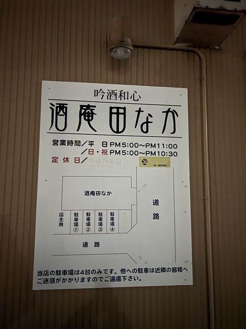 泉中学校傍の住宅街にある、酒庵 田なかさん。良い評判を耳にして気になっていた店。今日は新人歓迎会にて、コース料理を頂きに訪問した。尚、駐車は店の前に可能。