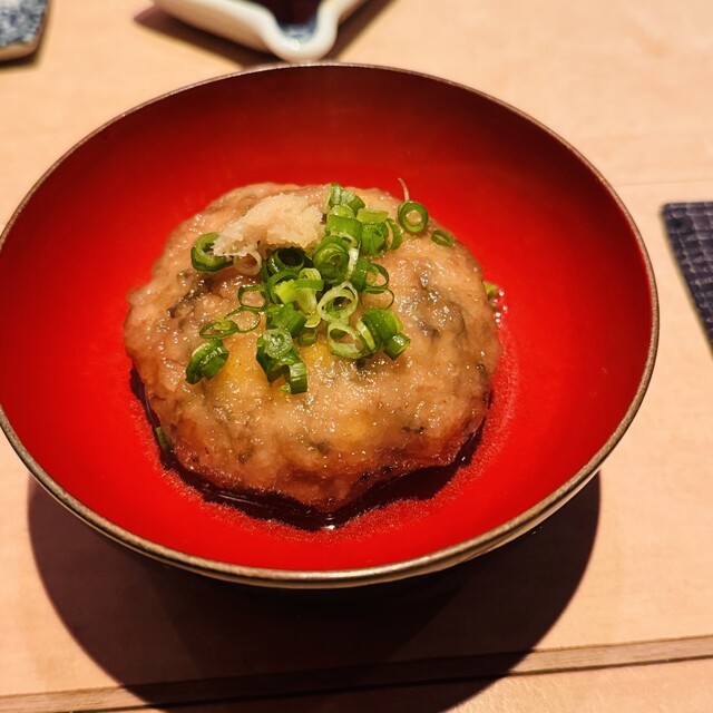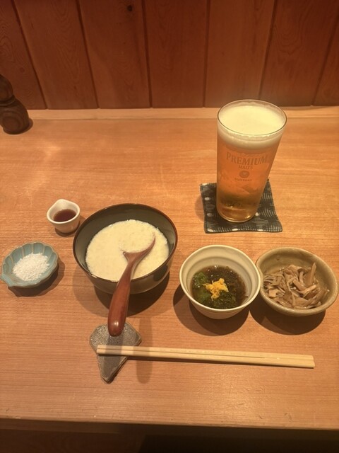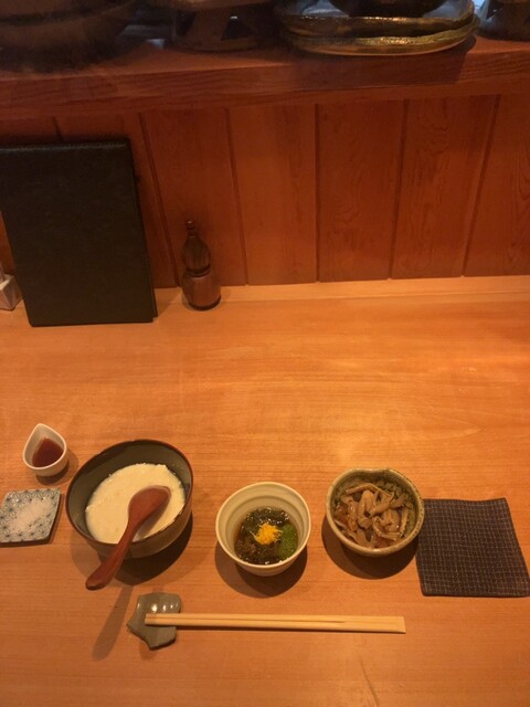 玄関脇の個室に案内され、席に着くと卓上には予め朧豆腐、アカモク酢の物、榎茸煮浸しが先付けにて並ぶ。早速、乾杯の儀を経て頂くと、それらは見た目に違わず酒を誘う美味。