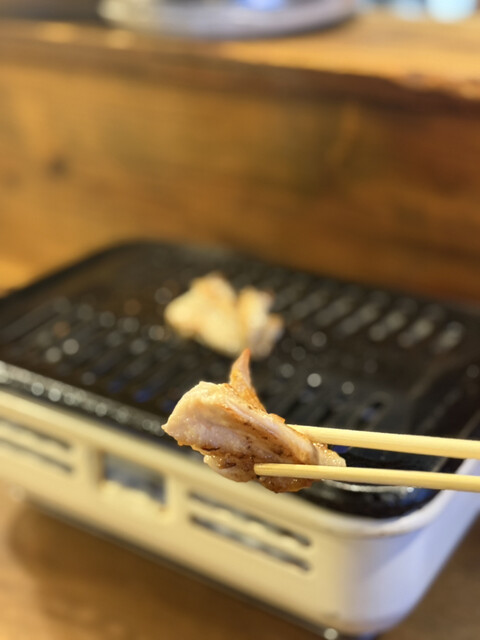 というわけで、いつものお通しのイカを塩で食い、鶏セットを頼む。ボンジリに…後忘れたけど、鶏の各部位を楽しみながら焼くことができます。あ、ヤゲンナンコツとかもあったかも!