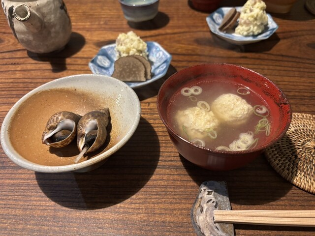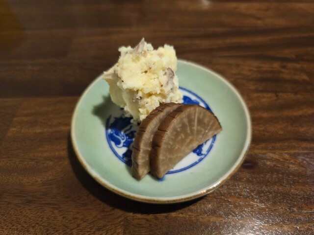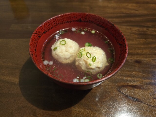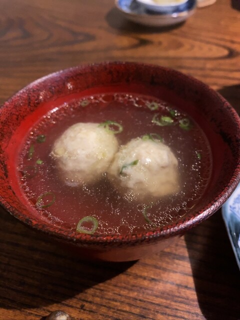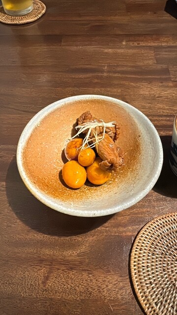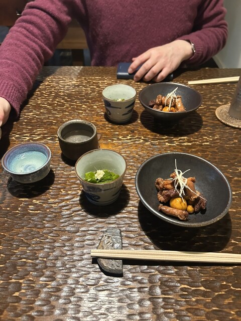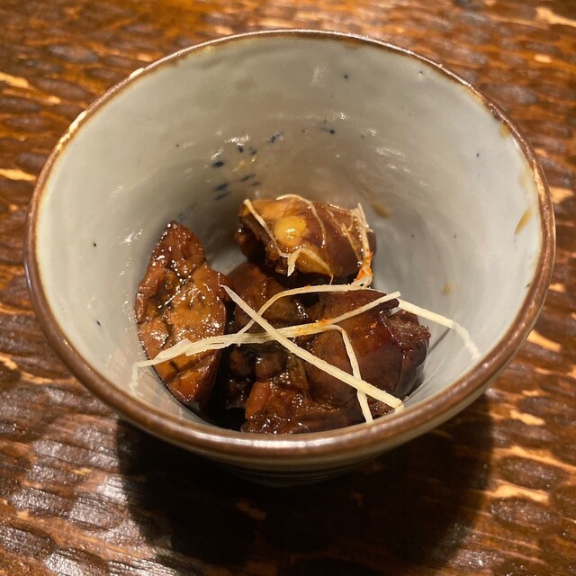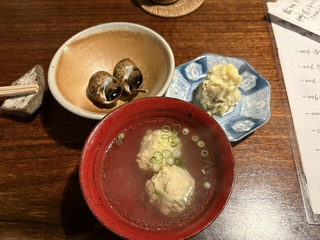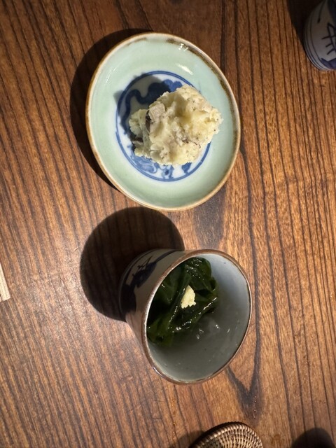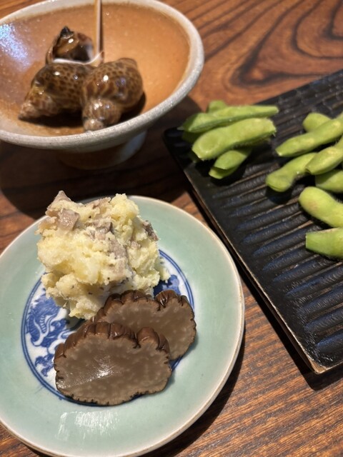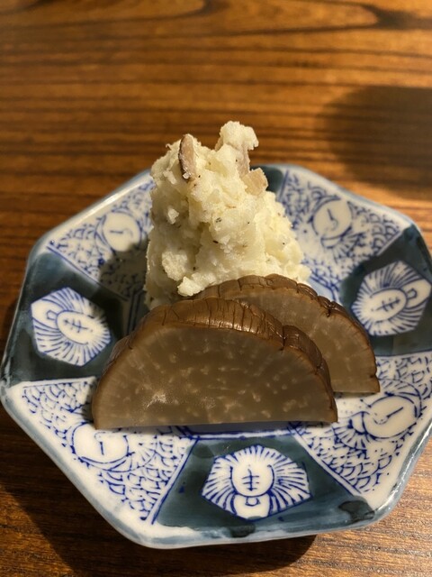 お通しが3品も、いぶりがっこの入ったポテトサラダ、ふだんポテサラは好みじゃないので食べませんがペロリです。比内地鶏のモツ煮もキンカンが入って美味しい、鶏のスープはコクがあってお代わりしたいくらい。お通しだけでも満足なんですが色々注文しました。