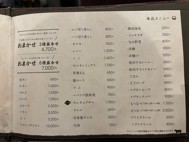 色々なメニューを味わいたかったのもありコースをオーダーしました。秋田牛中心の正肉、ホルモン、サイドメニューはバラン...