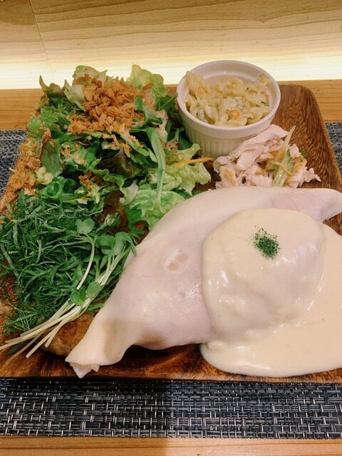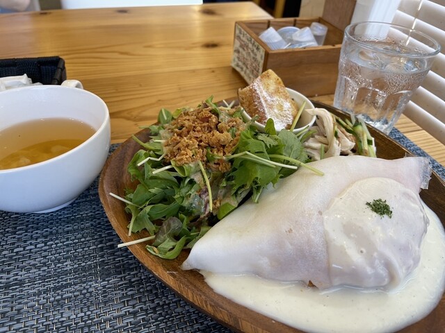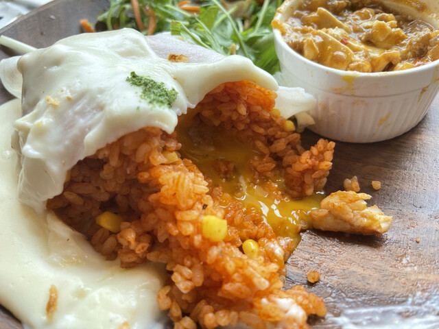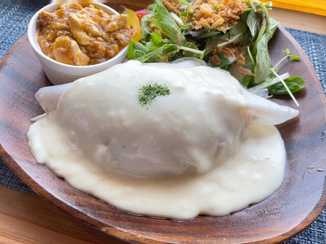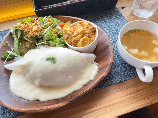通町ってパーキングがあまり無いので入りにくいお店が多いけど、こちらのカフェは3台分の駐車場があるので来店しやすいお店ですね。お店名物の白いオムライス900円は一般的な黄色い卵ではなく白い皮に包まれホワイトソースがたっぷりかけられているので見た目のインパクト大ですね。ワンプレートでサラダもたっぷり付いてゆっくりした時間を過ごせるお店でした。
