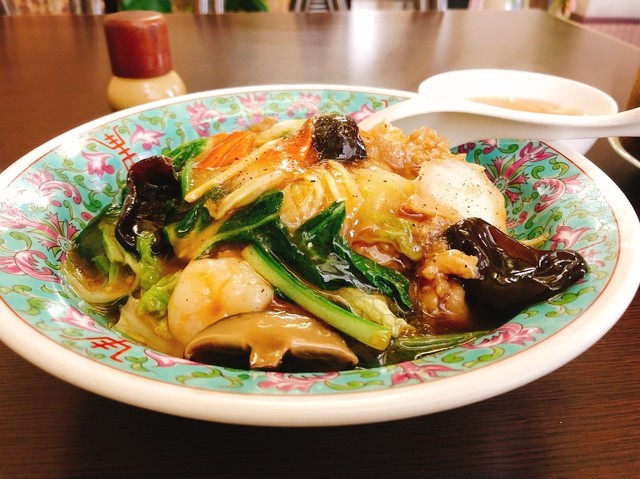 麺が予想に反し細麺でした、上の五目あんは具材がゴージャスな感じ