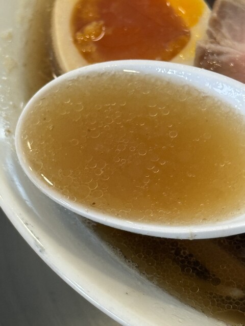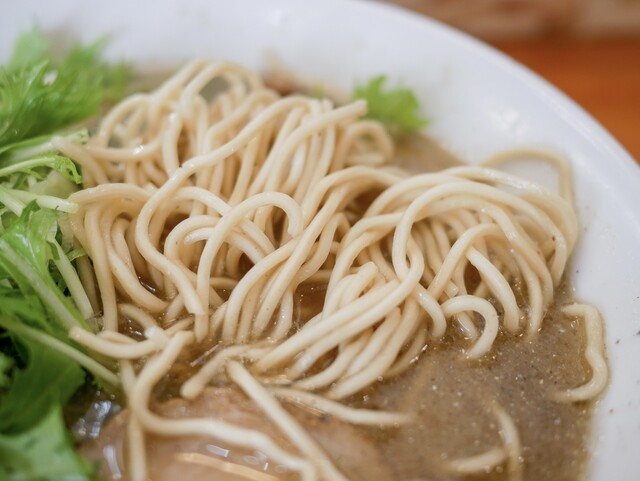 脂っ気なく和風な印象の 「あっさり」 は、根底にある煮干し出汁に豚と鶏の旨味が加えられ、昆布がそれらを纏めてサラリとしたスープに仕上がっている。麺はつるりとしているが、思いの外に汁絡は良好な丸断面の中太。あっさり系スープに太麺の組合せが余り一般的では無いかなと思うが、食すと不思議と良く合っている。
