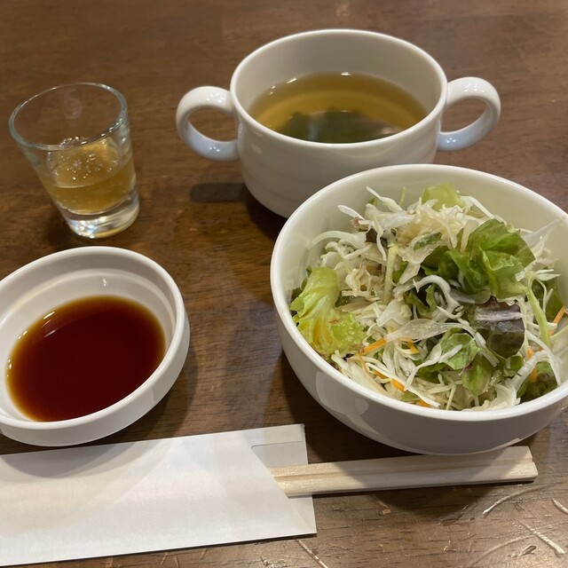 焼そばなのにサラダ、スープ、食後のドリンクまで付いている