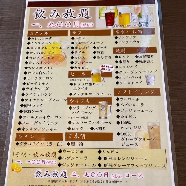 | ドリンク | 日本酒あり、焼酎あり、ワインあり、カクテルあり |