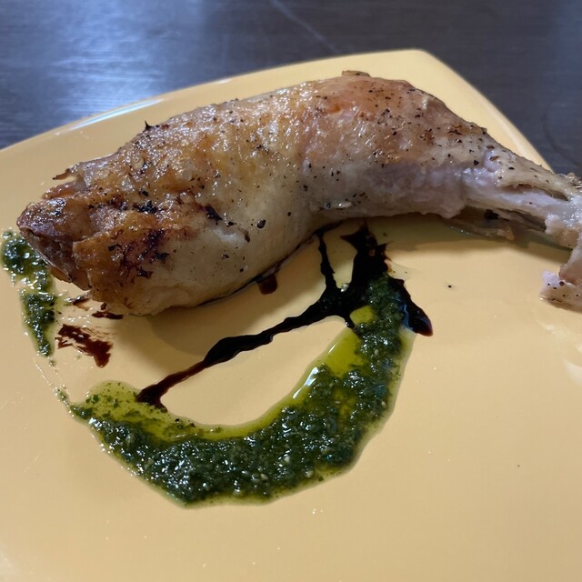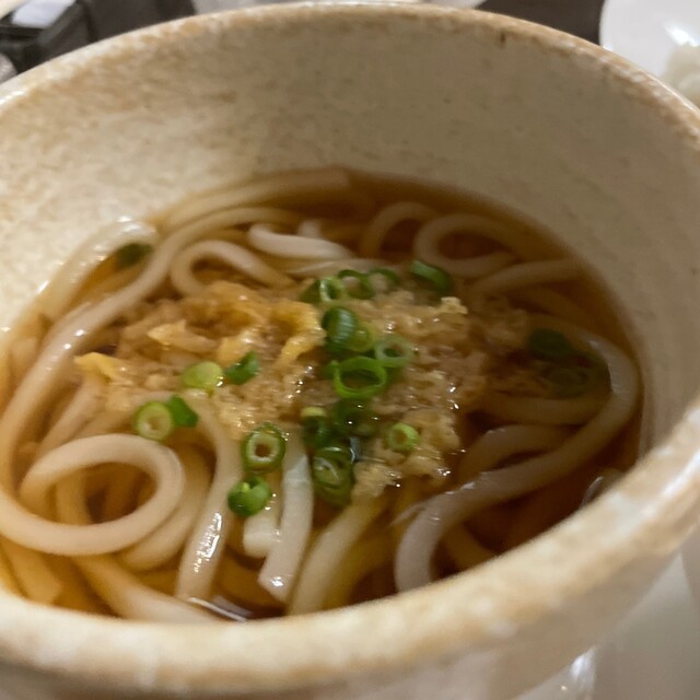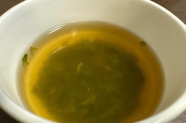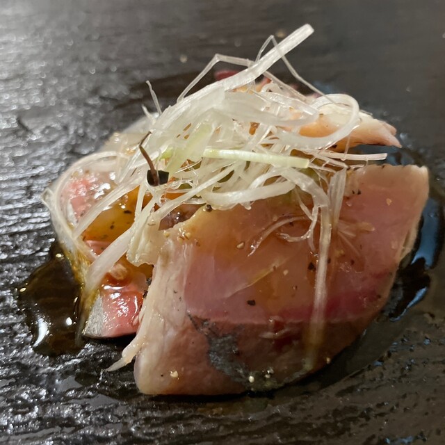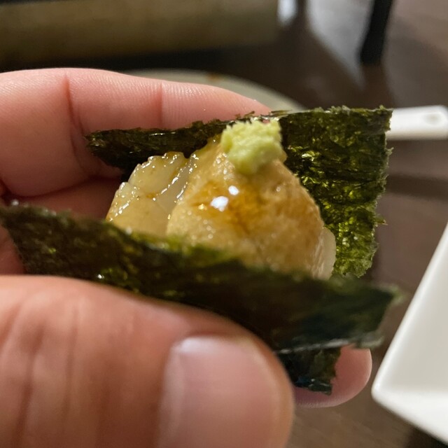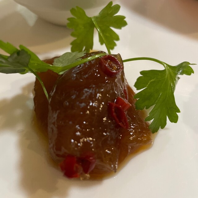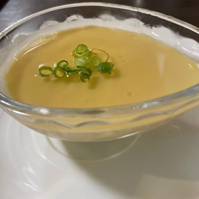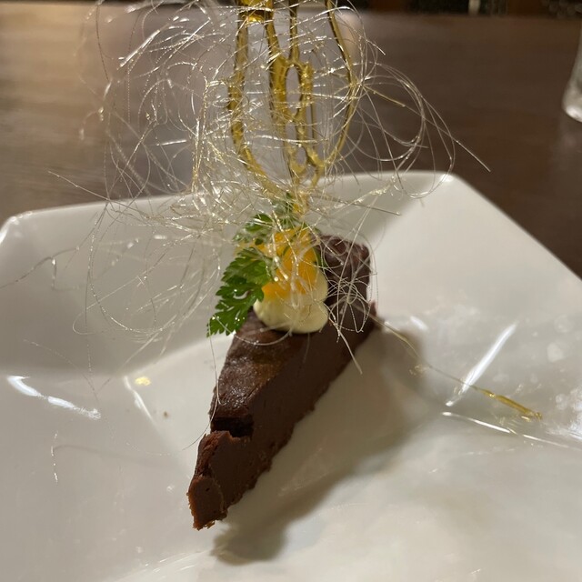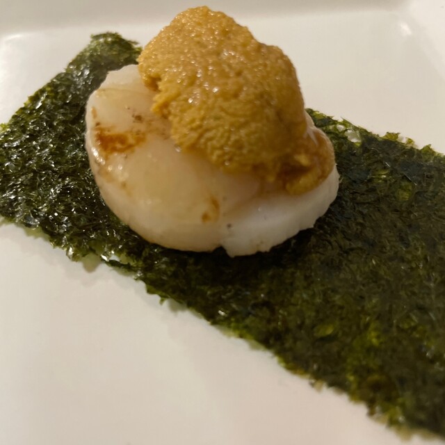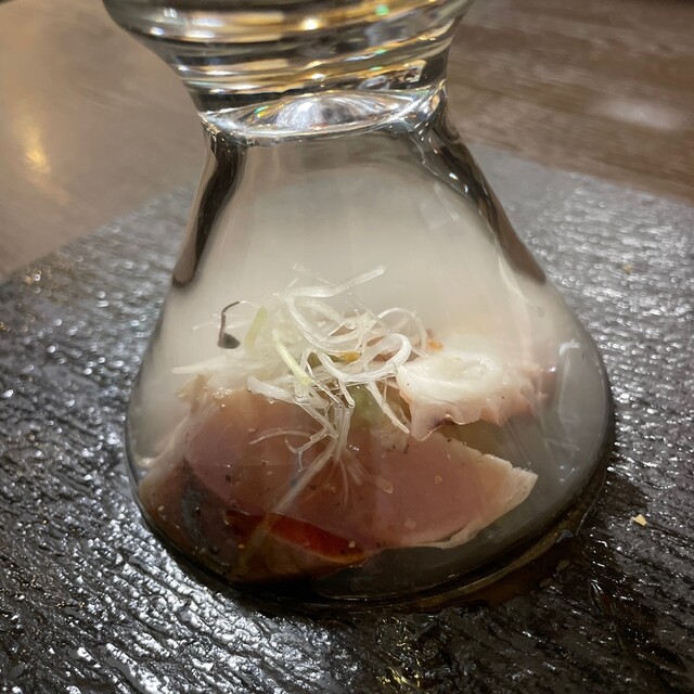 2週間前にランチで利用し、当たりの店と確信。コース予約して来訪。前日に苦手なものやアレルギーはないかの確認電話も心遣いを感じる。飲み放題を付けるか確認され、付けると即答。飲み物はデュワーズのハイボールでスタート。何と、グラスにデュワーズのロックと炭酸、マドラーが運ばれてくるスタイル。いいねぇ。鳥頭だから説明は忘れたけど、一品めの茶碗蒸しが到着。ちょい洋風だね。出汁じゃない。2品目は冷燻カルパッチョ。グラスで封をした中に煙が満ちている。開けようとしたら2分くらい待ってくれとのこと。今日は普段とは違ってお客さんが釣り上げてきたばかりのワラサも使っているとのこと。開けた瞬間煙と香りが鼻をくすぐる。ちゃんと香りがついてる〜。お次は焼き物。ホタテ、ウニ、海苔、わさび、醤油とハケが運ばれてきて、ホタテに醤油をハケ塗りして炙り、海苔に載せてその上にウニを乗っけて巻物にして食べてくれとのこと。不器用な私にできるのか疑問だったけどやってみる。美味い❗️ちょっと焼きが甘かったかもだけど。ただ出されたものを食べるんじゃなく自分で作るっていう要素も楽しいね。お次は3時間低温調理したという鶏モモのバジルソース添え。箸でほぐれるくらい柔らかい。バジルソースとベストマッチ。メインはちゃんぽん麺にカラスミパウダーをふってそれをイカ墨ソースで食べるというもの。イカ墨ソースが素晴らしい出来。中に刻んだ沢庵も入っている。もちろん初めて食べる味。美味ぁ。デザートはお任せにしたらガトーショコラが。飴細工が優雅でショコラはビターかつ繊細なお味。シェフは相当な腕だね。飲み放題付きで5,000円也。再訪確定のお店だわ。