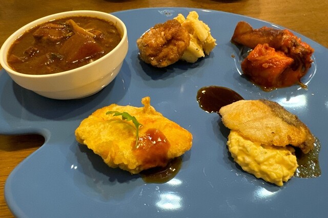 日替わりランチと海坊厨丼で悩んだ末、後者に。炙りと生の選択で生を。温泉卵、魚卵は大丈夫か、などのリサーチも嬉しい。しばらくしてスープ、サラダ、ショットグラスに入ったジュレが運ばれてくる。え、海鮮丼だよね?って確認したくなる。ま、いいや。前菜たちを片付け終わると本命の登場。直径20cmほどの丼に大ぶりのネタがてんこ盛り。小皿に入った醤油が添えられていてそれにネタをつけて食べるスタイル。リサーチにあった温泉卵やとびっこも入っている。結構なボリュームで満腹。食後のドリンクも付いて1,050円はコスパ抜群だね。創作料理を謳っているので次回はディナーで再訪してみようかな。